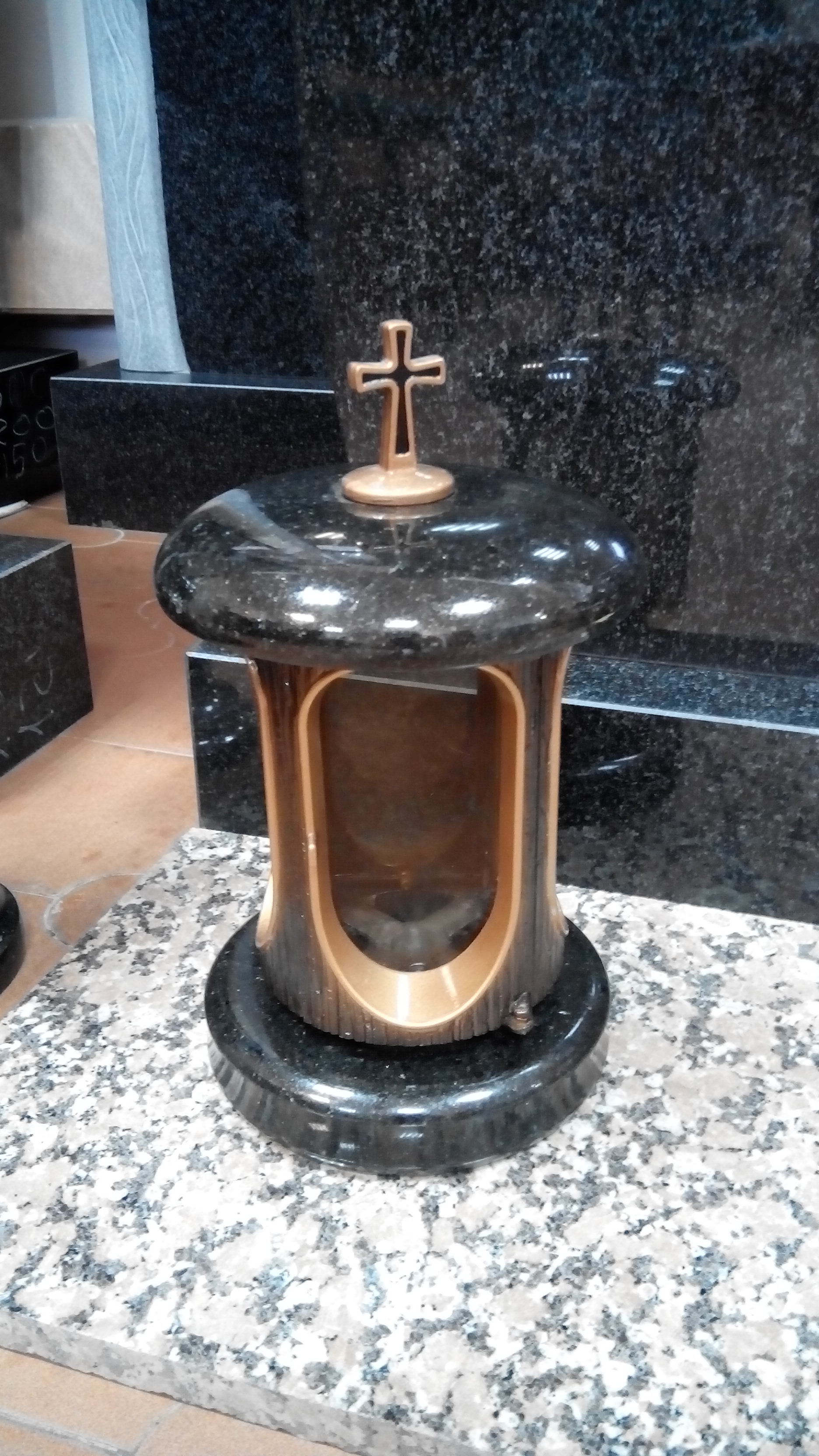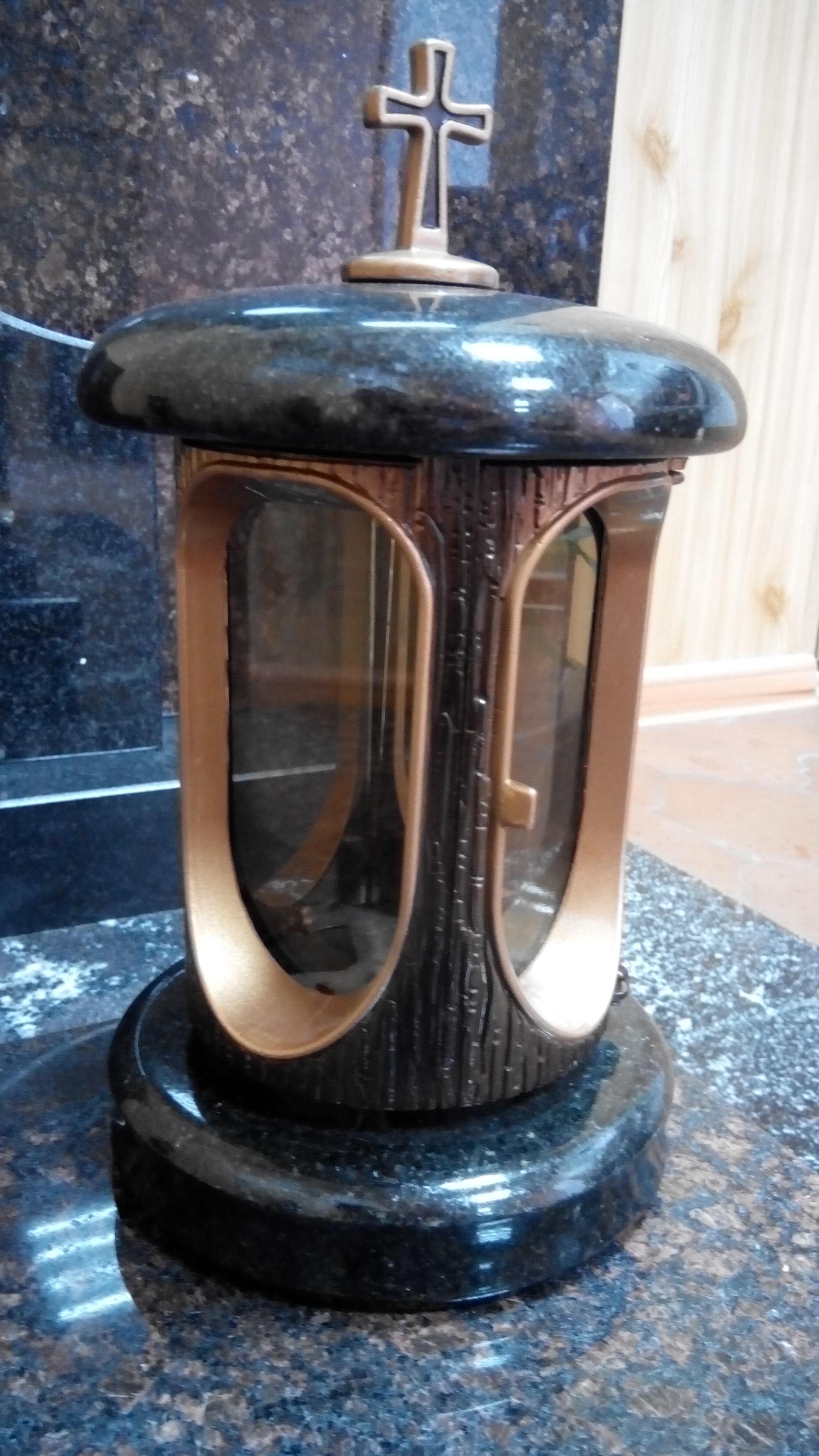 Лампадка из гранита «Габбро Диабаз» с латунью и стеклом по кругу. ​